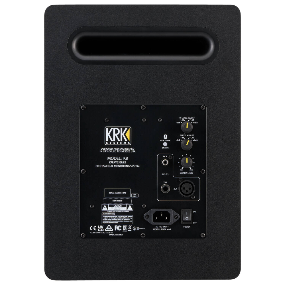 | 構成 2ウェイ・バスレフ方式 システムタイプ アクティブ・スタジオモニター 低域ドライバー ウーファー:8インチ Kevlarコーン、フェライトマグネット 高域ドライバー ツィーター:1インチ Kevlarドーム、ネオジムマグネット 周波数特性(±3dB) 48Hz〜40kHz 低域再生帯域( 10dB) 40Hz クロスオーバー周波数 2.5kHz アンプ構成 バイアンプ方式:低域 Class D、高域 Class A/B 低域アンプ出力 80W 高域アンプ出力 20W 総合出力 100W 総合ダイナミックパワー出力 210W 最大SPL(ペア) 111dB カバレッジ角度 水平130°×垂直85° アナログ入力 バランス XLR/1/4インチ TRSコンボ/アンバランス RCA ワイヤレス入力 Bluetooth Classic 5.3 A2DP SNR 94dB 電源入力 100 240 VAC (±10%), 50/60 Hz ヒューズ T4AL/250V(ユーザー交換不可) エンクロージャー PVCビニール巻きMDF バッフル 補強HIPSフェイスプレート付きMDF 製品サイズ 388×275×304 mm 製品重量 9.3 kg |