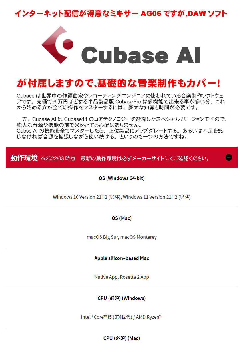 | ・本セットはiOSデバイス用のLightning端子変換ケーブルセットです。※一部USB TYPE C搭載のiOSデバイスがございます。お手持ちのデバイスがLightning端子付きのiOSデバイスであることをご確認ください。 ・AG06mk2はiOSデバイス対応のUSBミキサーですが、アプリにより動作状況が異なります。 ・Steinberg DAWソフトウェア「Cubase AI」のダウンロード、インストール手順、および設定方法については、ヤマハ公式サイトをご覧ください。その際、付属のCUBASE AI DOWNLOAD INFORMATIONをご用意ください。 ※製品の仕様及びデザインは改良のため予告なく変更することがあります。また、モニタの設定などにより色調が実物と異なる場合がございます。ご購入後に思った色と違うなどでのキャンセルはご遠慮下さい。 ※こちらの商品は店頭及び他のショッピングサイトでも販売を致しております。タイミングによっては売り切れの場合がございます。ご注文時に売り切れの場合は、お取り寄せにお時間を頂くこととなります。予めご了承下さい。 |