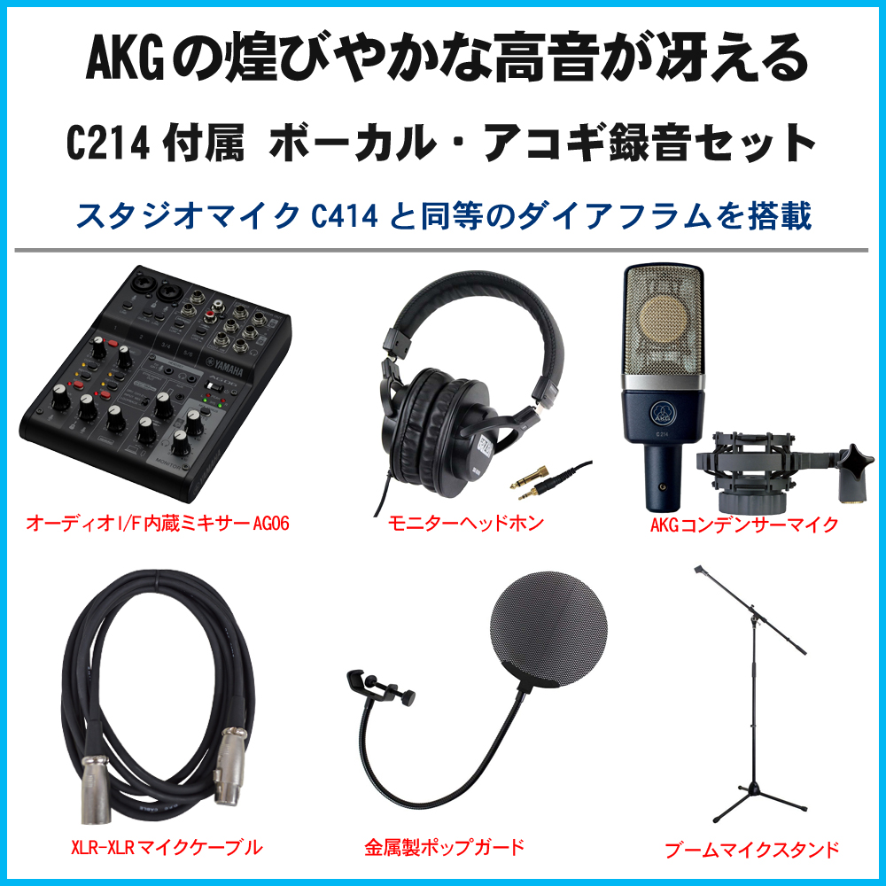 | 【セット内容】ミキサーAG06mk2 Black/AKG コンデンサーマイク C214(ショックマウント・ケース付属)/湿度対策袋&乾燥剤/ブームマイクスタンド/マイクケーブル/ポップガード/モニターヘッドフォン/4極ステレオミニケーブル(スマホ対応) | ||||||||||||||||||