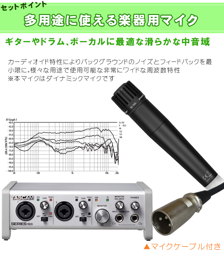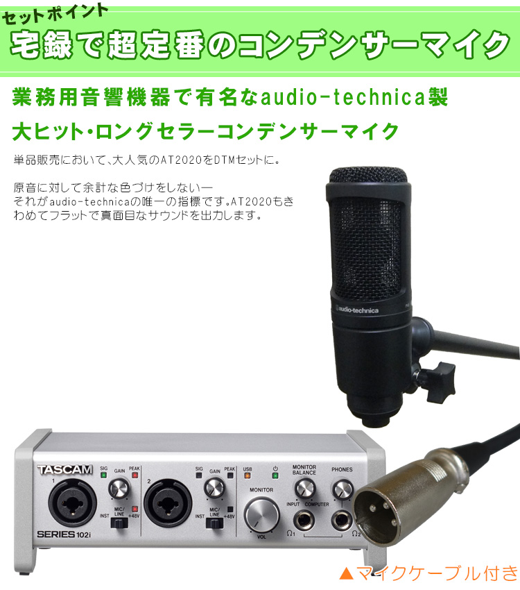 | 【セット内容】USBオーディオインターフェイス Series102i×1/ヘッドフォン/audio-technicaコンデンサーマイク AT2020(専用マウント付属)/ブームマイクスタンド/BEHRINER 楽器用ダイナミックマイク/ショートブームマイクスタンド/3mマイクケーブル×2 |