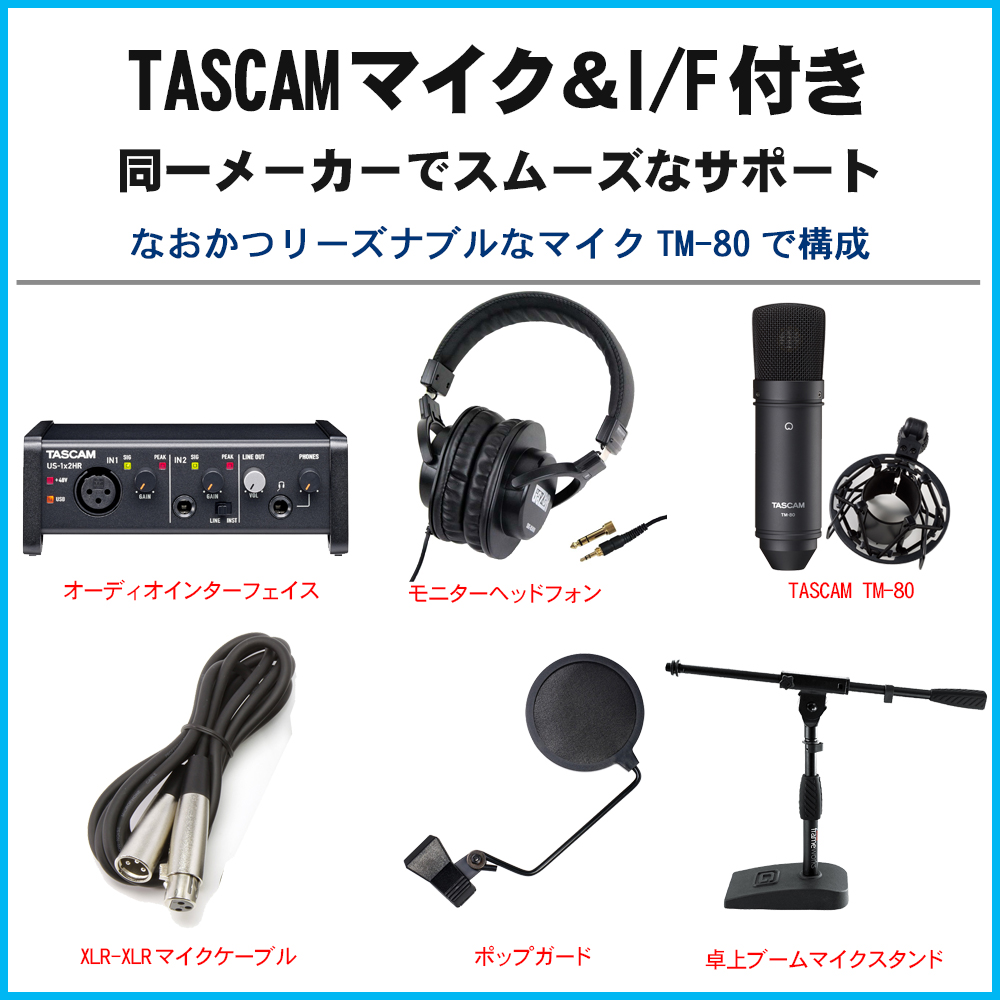 | 【セット内容】TASCAM オーディオインターフェイス US-1x2HR×1/TASCAM コンデンサーマイク TM-80(ショックマウント、XLRマイクケーブル 3m付)/ポップガード/卓上ブームマイクスタンド/モニターヘッドフォン | ||||||||||||||