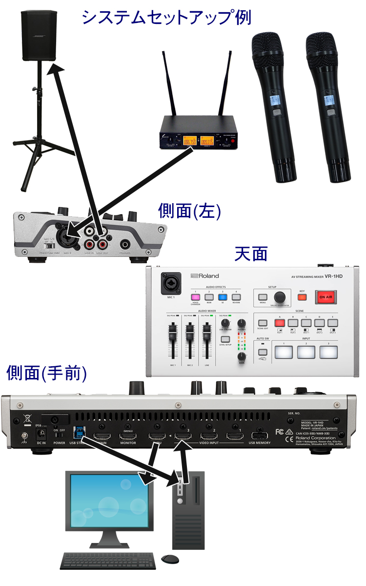 マイク2本までのご利用であれば、ミキサーが不要となるため省スペースでのセッティングが可能となりました。また、先代モデルV-1HDには無かった機能として、PC接続への対応が上げられます。VR-1HDにはUSB3.0のストリーミング端子を新たに搭載しており、ビデオキャプチャーボードなどを使用せずパソコンへ映像を取り込めます。