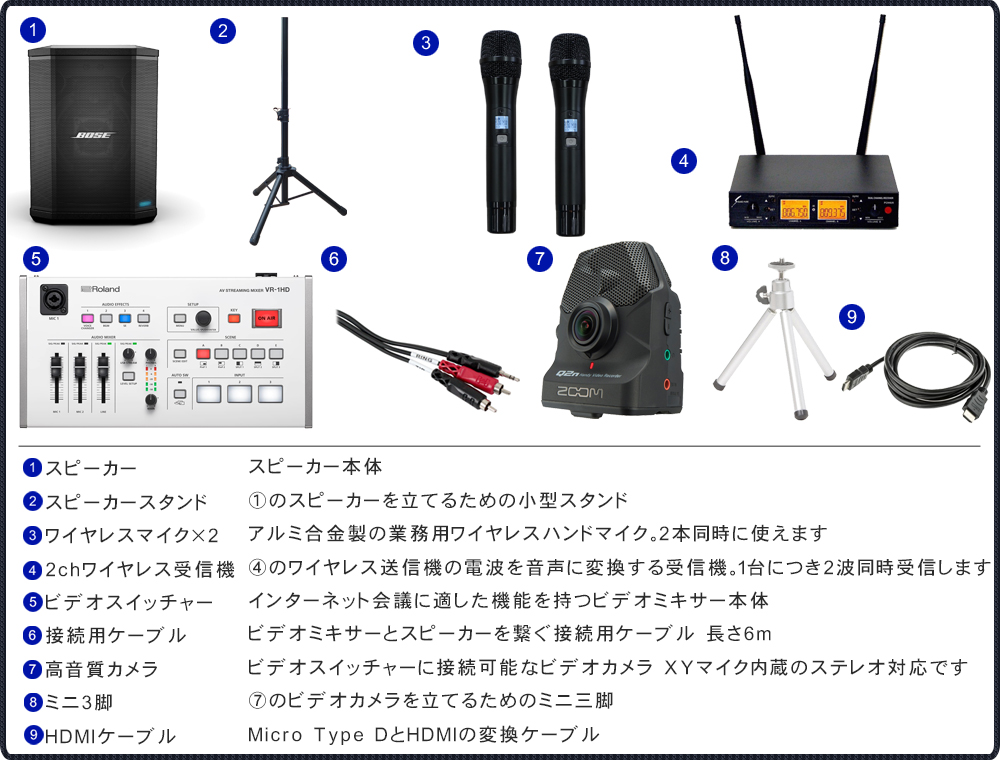 | 【セット内容】ビデオミキサーVR-1HD×1/BOSE ポータブルスピーカーS1Pro×1/小型スピーカースタンド×1/SOUNDPURE ワイヤレスマイクH-80112×2/SOUNDPURE 2chワイヤレス受信機×1/ミキサー→スピーカー接続用ケーブル6m×1/高音質カメラQ2n×1/HDMI変換ケーブル×1/ミニディスプレイ(接続ケーブル付) |