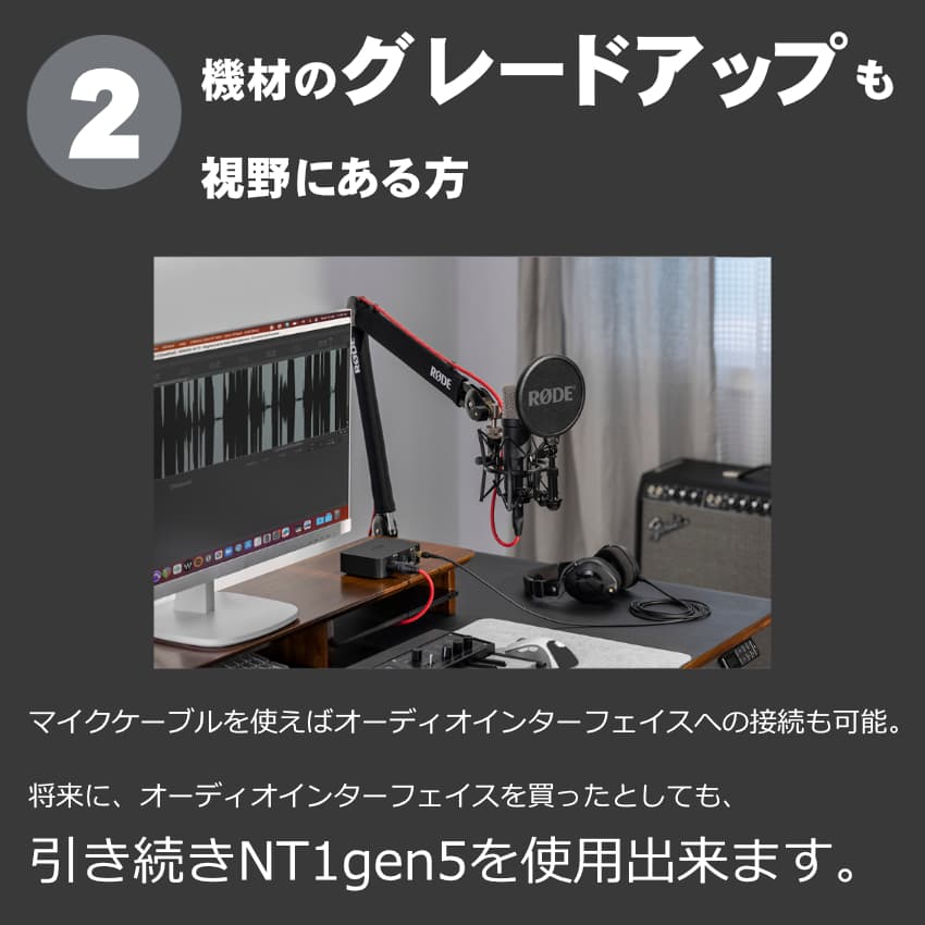 | Q1)ライブで使えますか。 楽器集音としてならご利用頂けます。ボーカル用としてはあまり一般的ではありません。意図しない限りはステージやライブでのご利用には「ハンドヘルド型」のコンデンサーマイクか、ダイナミックマイクのご利用をお勧め致します。 Q2)PCのカラオケサービスで使えますか。 USBマイクに対応するカラオケサービスであれば、使用できる場合もございます。NT1gen5にはエコー機能やヘッドフォン出力が無い点にご留意下さい。厳密にはカラオケサービスによって異なります。より確実にご利用頂くには、エコー機能とファンタム電源を備えたミキサーに繋いで、ミキサー経由でカラオケをお楽しみ頂くことです。 Q3)iPhoneやAndroidには対応していますか。 2023/03時点ではWindows/Macのみ対応となっております。最新の動作条件につきましては、RODE公式サイトにてご確認下さい。 |