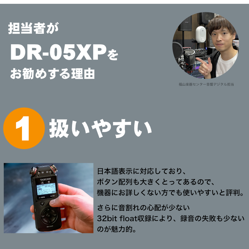 【メーカーサイトより】 『DR-05XP』は、音楽、動画制作、フィールド、会議、インタビューなど様々な用途でプロ品質の録音や、音声配信を簡単に行えるポータブルハンドヘルドレコーダーです。32ビットフロート録音に対応し、入力レベルの設定を気にせず録音可能。小型軽量のため片手で簡単に操作でき、大切な瞬間を逃しません。 |