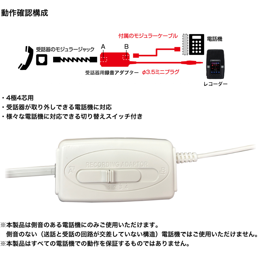 受話器用録音アダプターと、当店にて動作確認済みのレコーダーをセットにしました。