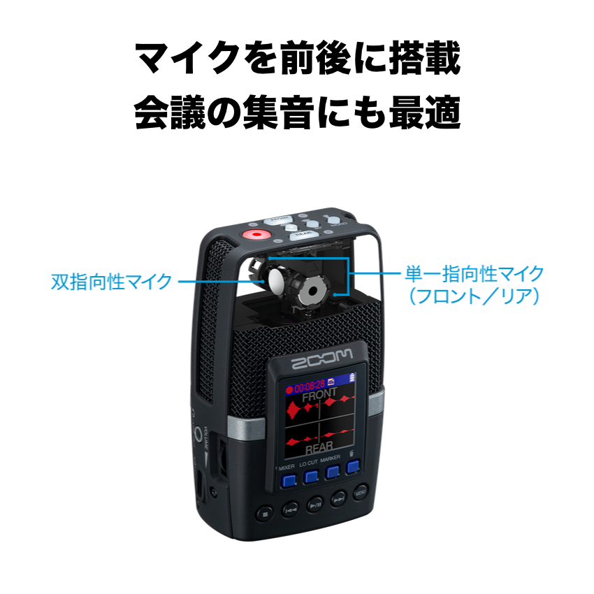 また、レコーダーには前後にマイクを搭載しており、机を囲んで行う会議の録音にも最適。
