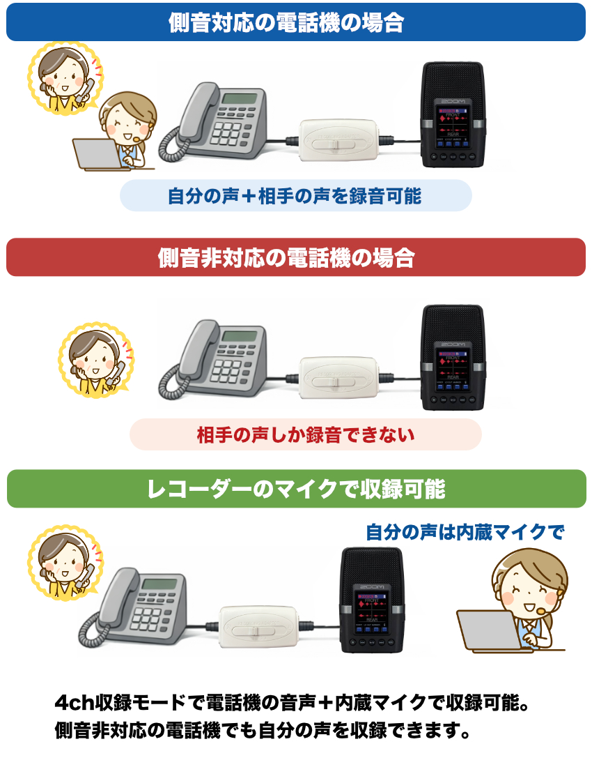 本セットは、お使いの電話機の仕様に応じて、適切な方法で通話録音が可能です。