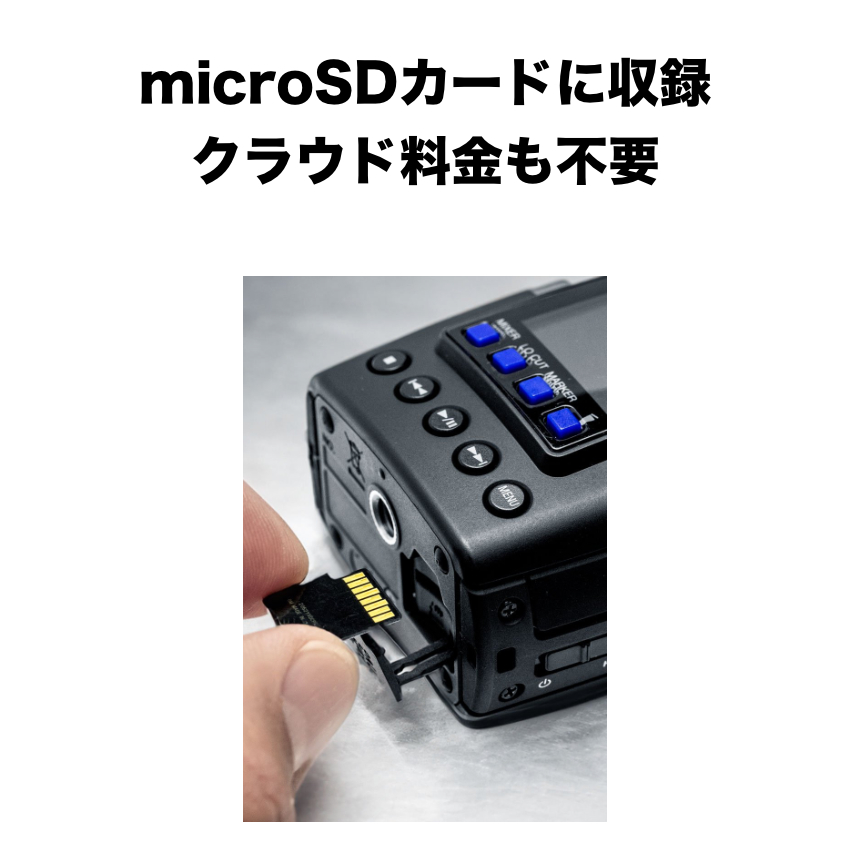 録音データはmicroSDカードに保存されるため、クラウドサービスを利用する必要がなく、月額費用もかかりません。