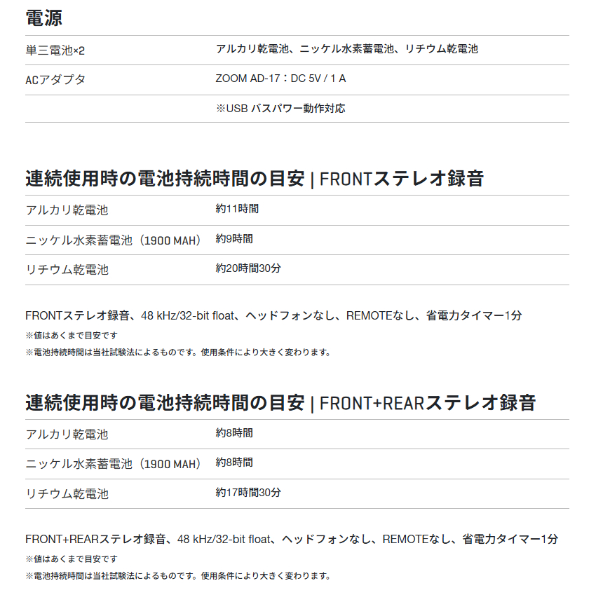 単三電池×2(アルカリ乾電池、ニッケル水素蓄電池、リチウム乾電池)