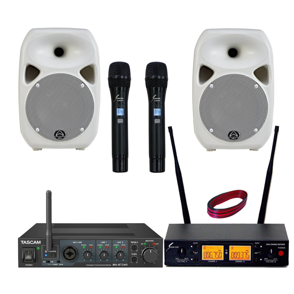 ワイヤレスマイク2本+アンプ・白いスピーカー付き 設備音響セット 会議室 カフェ ライブスペース 165,000円(税込) |