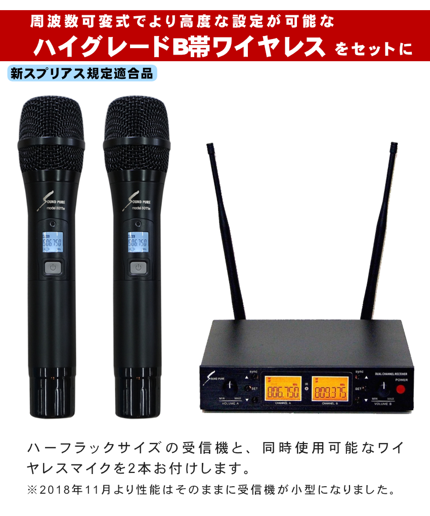 【セットの特徴】 音響レンタル業者様などにも多数ご利用頂いておりますSOUNDPUREのワイヤレスマイク2本をお付けした会議・セミナー向けコンパクトスピーカーセットです。ワイヤレスマイクは2本同時にご利用頂けます。初期状態で周波数設定が行われていますが、近隣設備と混信した時には周波数を変更し混信を回避することも。