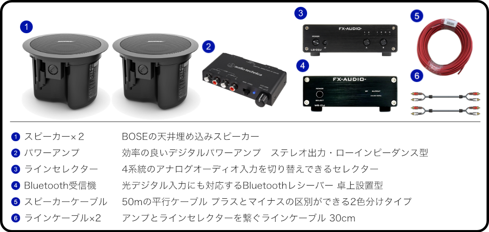 【セット内容】BOSE天井埋め込みスピーカー FS2CB(2本1組)/audio-technica デジタルパワーアンプ/Bluetoothレシーバー/ラインセレクター/50cmRCAケーブル×2.スピーカーケーブル50m |