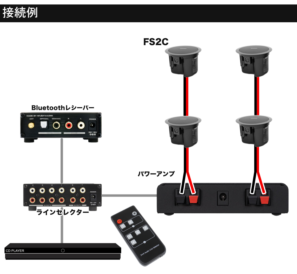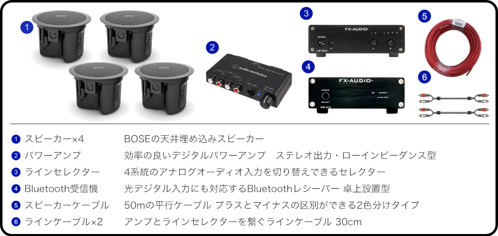 【セット内容】BOSE天井埋め込みスピーカー FS2CB(2本1組)×2(計4本)/audio-technica デジタルパワーアンプ/Bluetoothレシーバー/ラインセレクター/50cmRCAケーブル×2.スピーカーケーブル50m |