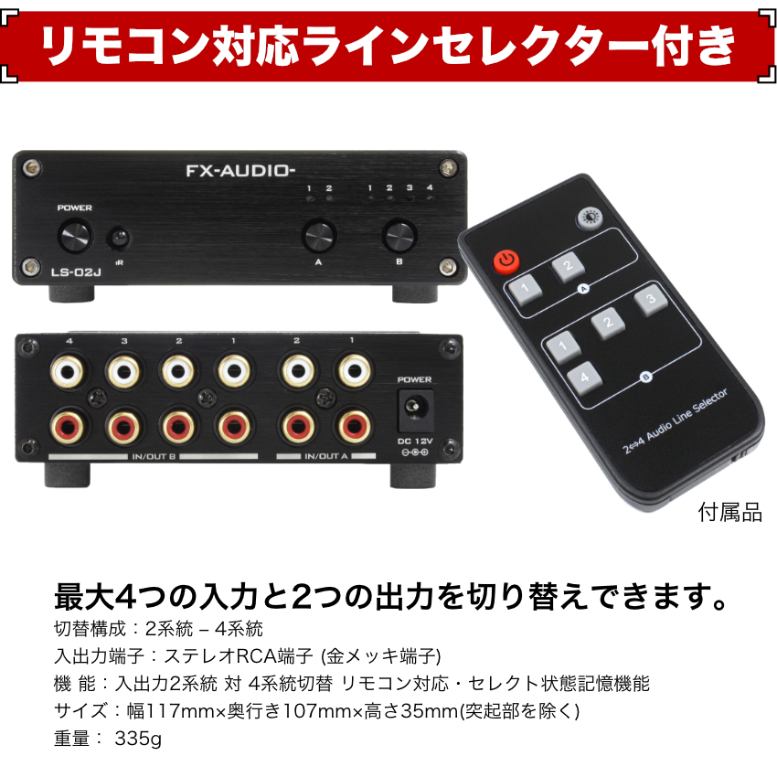 自宅や店舗にお勧めのBluetooth受信機+ラインセレクターのセット。ラインセレクターを使用することで、最大4つの再生機器を繋ぎ、切り替えて使用することができます。例えば、BluetoothとCDプレイヤーを切り替えて使用する といった事が可能となります。ラインセレクターはリモコンにも対応しています。
