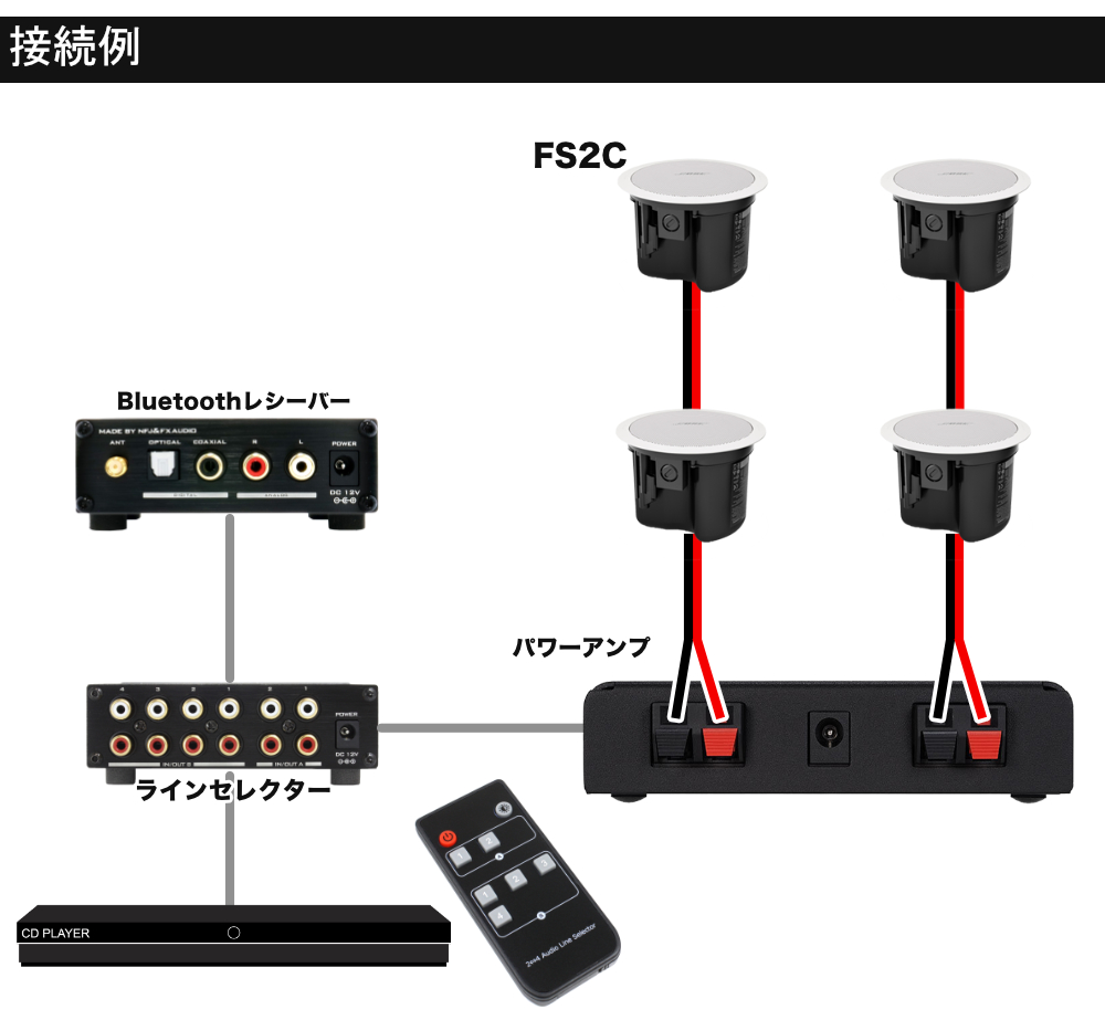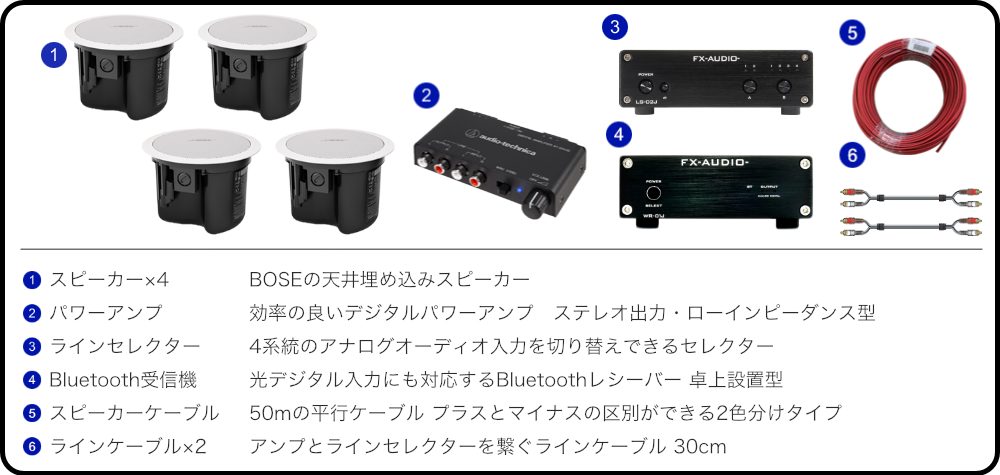 【セット内容】BOSE天井埋め込みスピーカー FS2CW(2本1組)×2(計4本)/audio-technica デジタルパワーアンプ/Bluetoothレシーバー/ラインセレクター/50cmRCAケーブル×2.スピーカーケーブル50m |