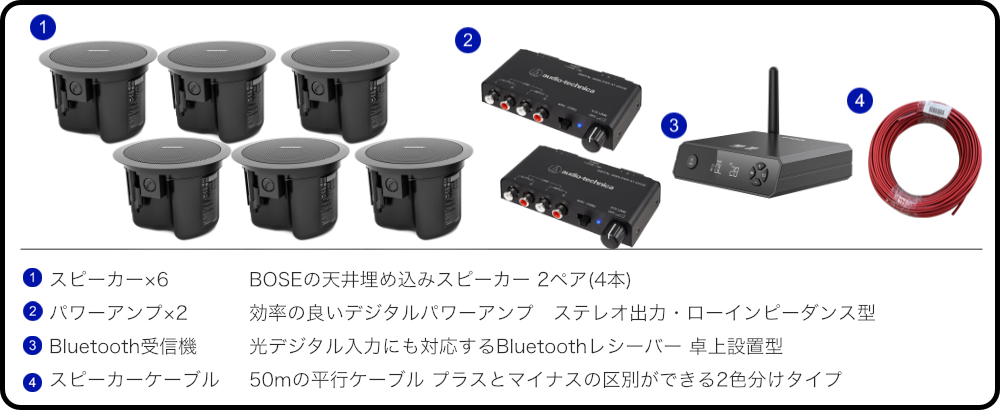 | 【セット内容】BOSE天井埋め込みスピーカー FS2CB(2本1組)×3(計6本)/audio-technica デジタルパワーアンプ×2/RCAピンケーブル50cm×2/Bluetoothレシーバー/スピーカーケーブル50m |