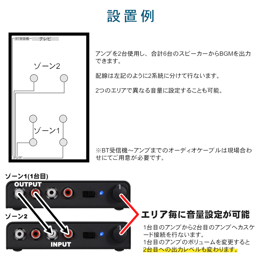 同時出力可能な天井埋込スピーカー6本セットです。会話を妨げない程度のBGM再生に適した小型アンプ2台が含まれ、スピーカー4本+2本の組合わせで計6本同時出力が可能なセットとなっております。ボリューム調整により簡易的なゾーニングも可能となっております。