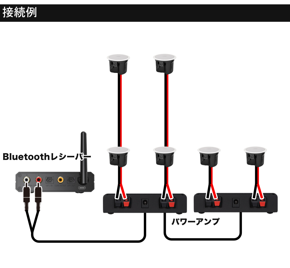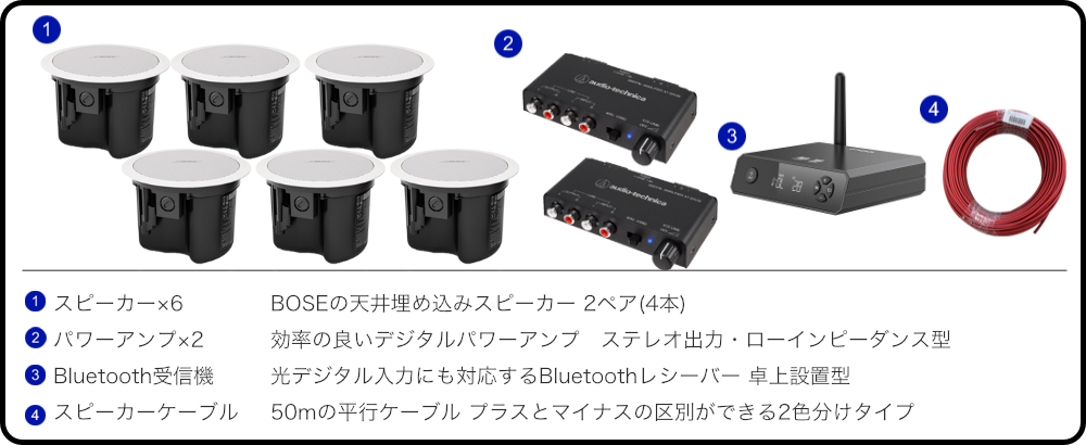| 【セット内容】BOSE天井埋め込みスピーカー FS2CW(2本1組)×3(計6本)/audio-technica デジタルパワーアンプ×2/RCAピンケーブル50cm×2/Bluetoothレシーバー/スピーカーケーブル50m |