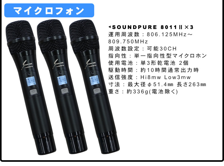 会議室や視聴覚室などに人気の800MHzワイヤレスマイクセットです。800MHzワイヤレスマイクは設置を容易に行えるワイヤレス周波数です。主に近隣施設(周囲200m)でワイヤレスマイクを使用していない設備にお勧めの仕様です。マイクはSOUNDPUREの8011IIをセットに。耐久性の高いマイクです。
