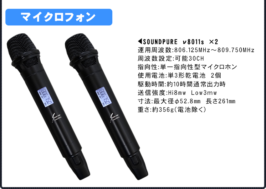 会議室や視聴覚室などに人気の800MHzワイヤレスマイクセットです。800MHzワイヤレスマイクは設置を容易に行えるワイヤレス周波数です。主に近隣施設(周囲200m)でワイヤレスマイクを使用していない設備にお勧めのワイヤレスマイクです。