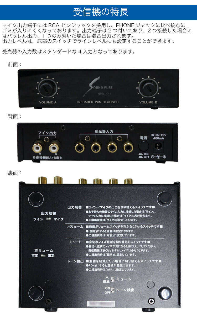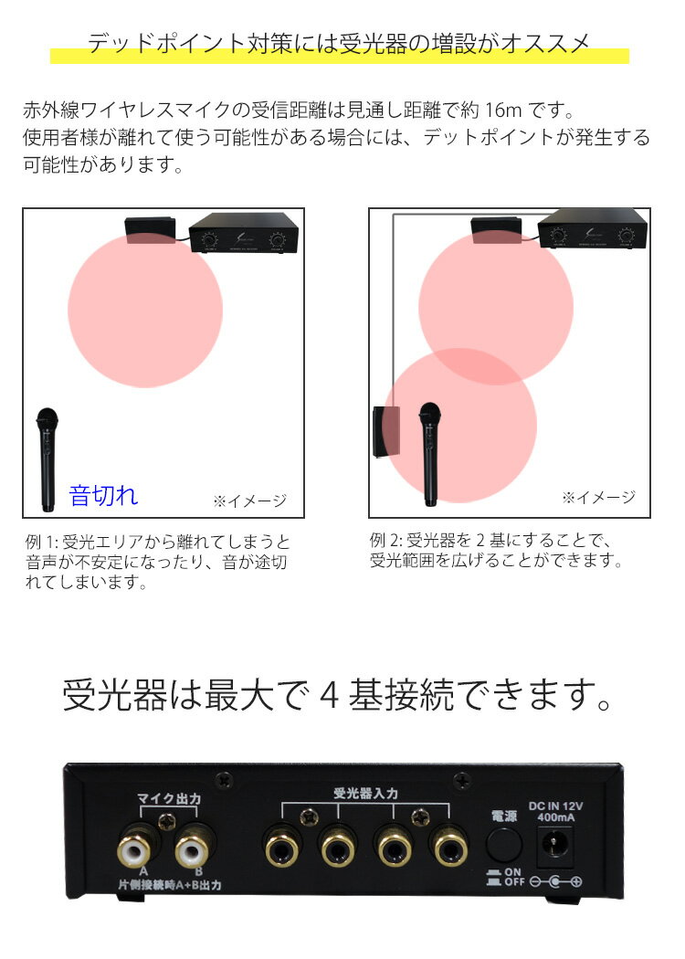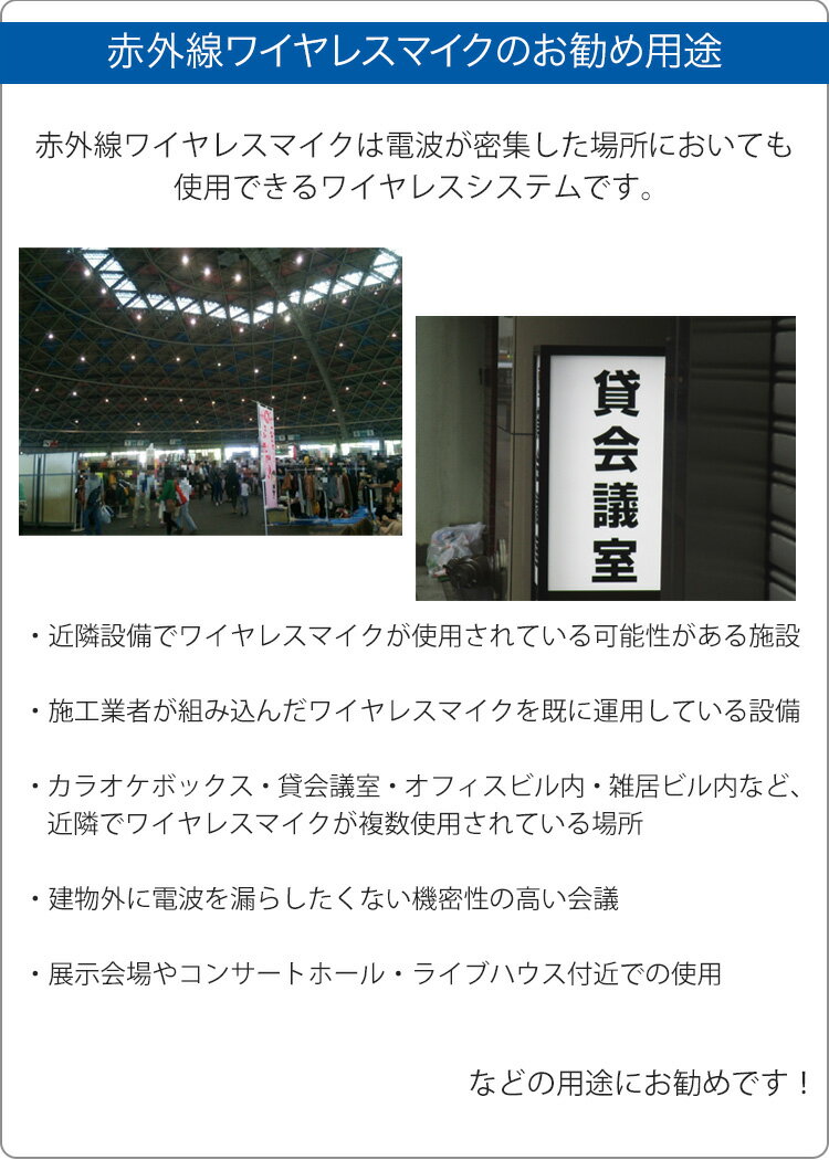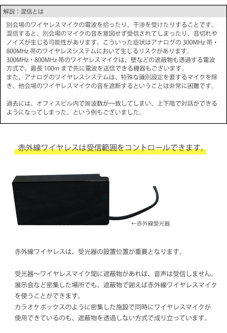 貸し会議室やカラオケボックスで一般的な赤外線ワイヤレスマイク付きセットです。マイクの専用充電器が付属致しますので、使用後にも定期的に充電ができます。赤外線ワイヤレスマイクは壁などの遮蔽物を浸透しないワイヤレスマイクとなります。ワイヤレス受信機とは別に受光器を設置することになります。受光器の設置位置により受信範囲をコントロールすることもできます。近隣設備との混信が起きにくくまた電波の傍受ができない為、セキュリティー面も安心です。赤外線マイクはプロジェクターの付近や屋外など、強い光源を発する物の近くではご利用頂けません。