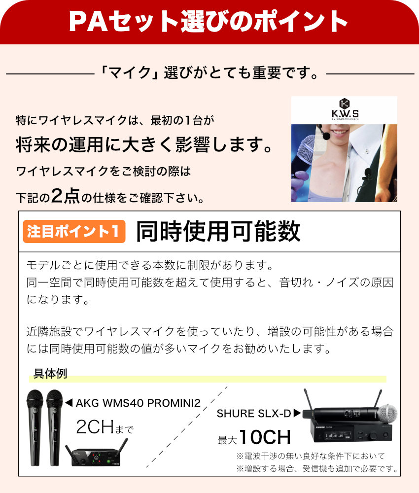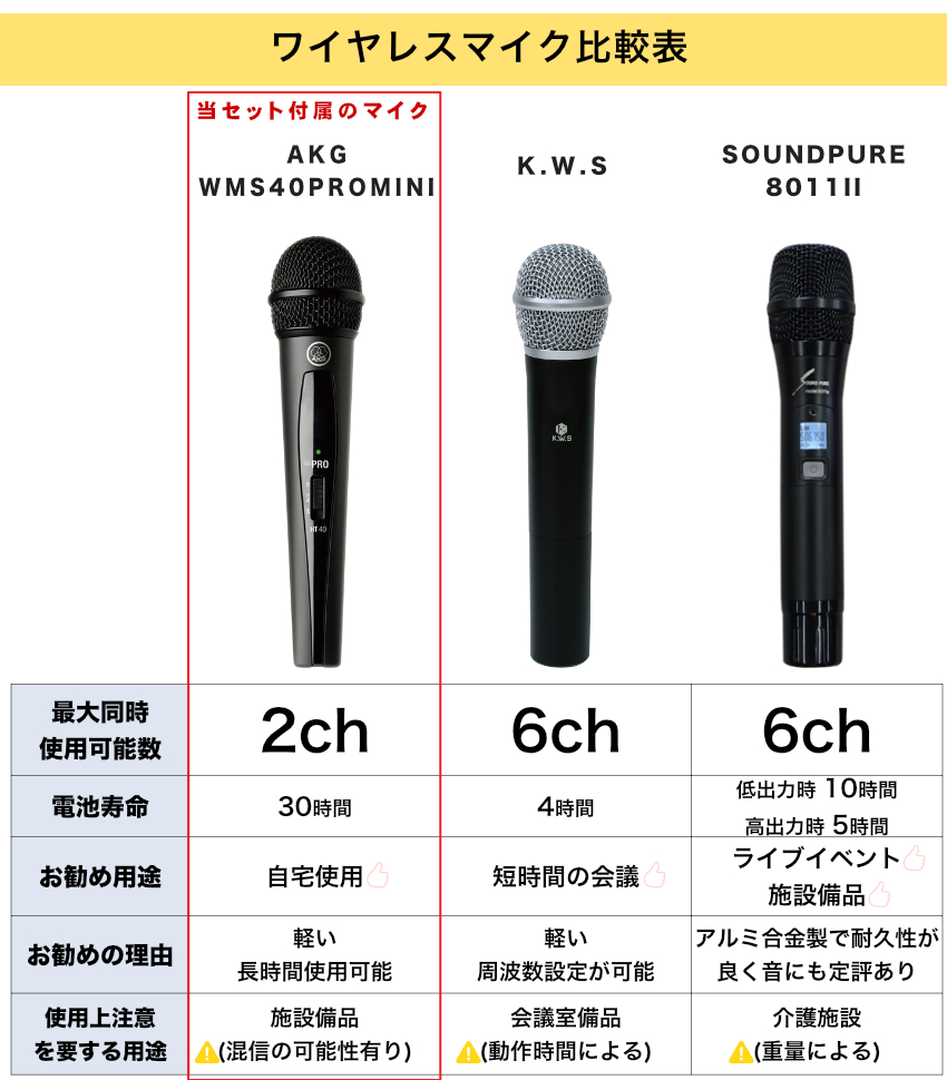 周波数設定不要で使える簡単ワイヤレス「AKG WMS40 PRO MINI2 VOCAL SET DUAL」付きのセット。周囲でワイヤレスマイクを使用しない環境下にはリーズナブルで魅力的なワイヤレスマイクです。