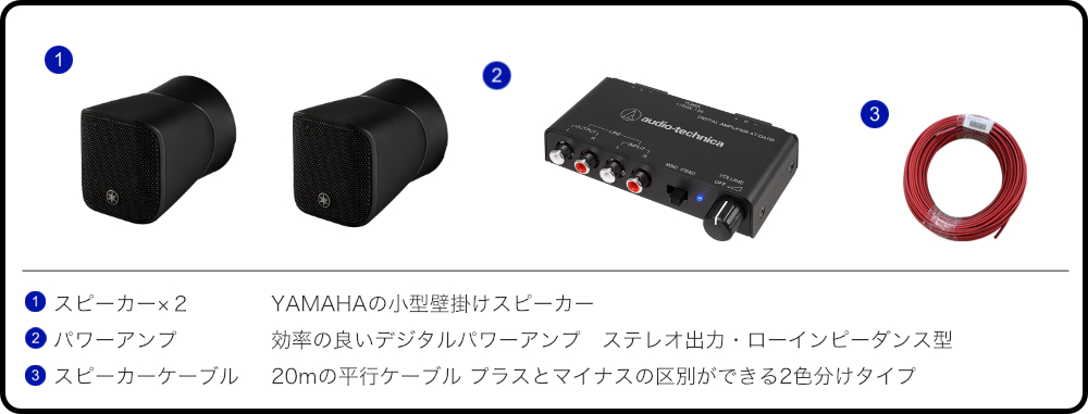 | 【セット内容】YAMAHA 小型スピーカー ×2/BGM用アンプ×1/10mスピーカーケーブル×2 | ||||||||||