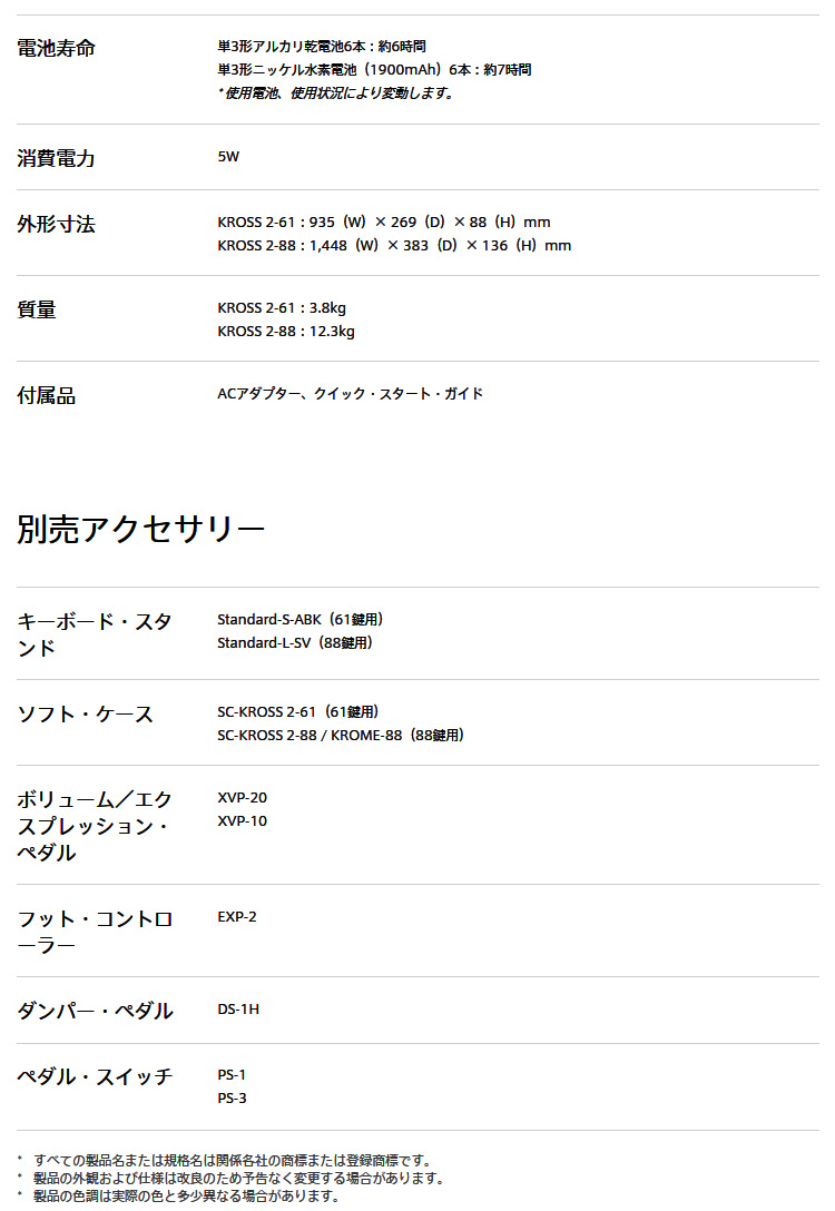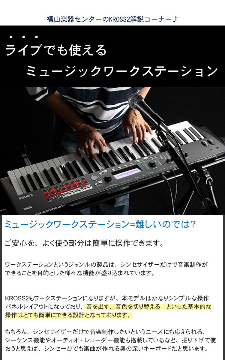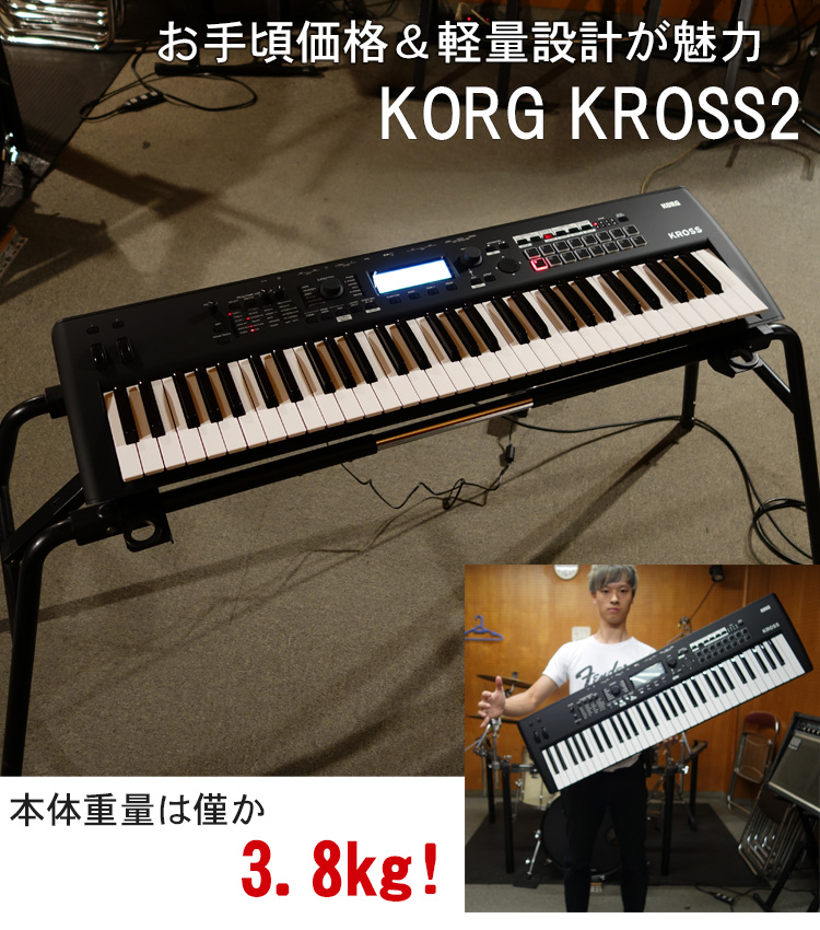 X-50の後はシンセサイザーの入門価格帯が上がっていますが、そういった市況下で安い部類に入るのが当機種KROSS2です。KROSS2の前には、実勢売価6万円台のKROSSが存在しており、弊社でも売れ筋商品の1つとなっておりました。そのKROSSにフィードバックを反映させたのが本モデルKROSS2となります。