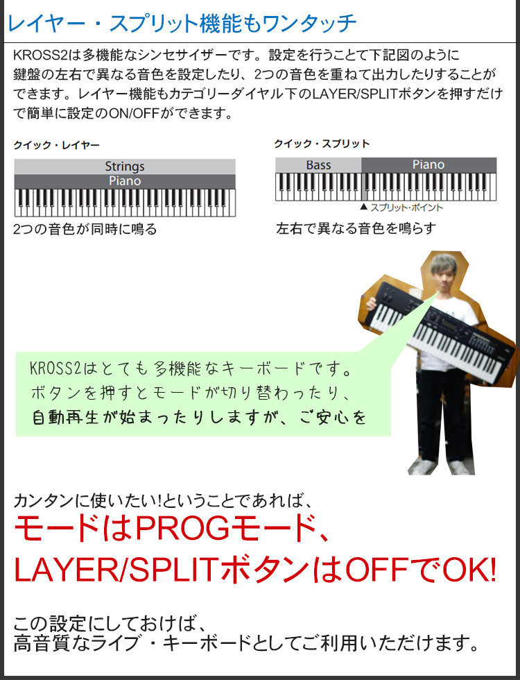 KROSS2はワークステーションというジャンルの製品になりますが、音色切り替えやライブ用の設定はとても簡単に行えるように工夫がされていると感じ取れました。