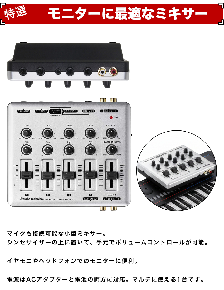 ワイヤレスイヤモニ付きのオールインワンセットです。 ステージモニターが十分に整っていない環境でも、イヤフォンを通して安定したモニタリングが可能です。 モニター用のミックスバランス調整に便利な小型ミキサーを同梱。 PA環境がある場合は、PA卓からのAUX SENDを小型ミキサーへ接続することで、手元で自分好みの音量バランスに調整できます。 また、PA環境がない場合でも、モニターしたい楽器にマイクを立てて小型ミキサーへ接続すれば、マイク越しのサウンドをイヤフォンでモニタリング可能。 ライブ、リハーサル、簡易ステージなど、さまざまな現場で柔軟にお使いいただけるセットです。