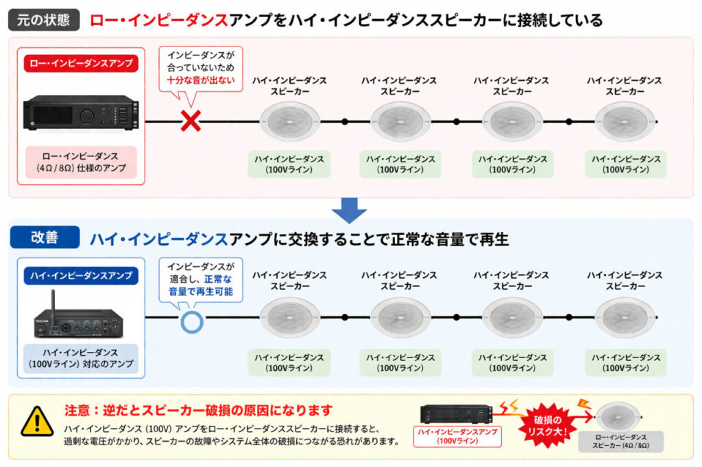 天井スピーカーの音が小さい?原因は“インピーダンス不一致”でした【復旧・診断事例】